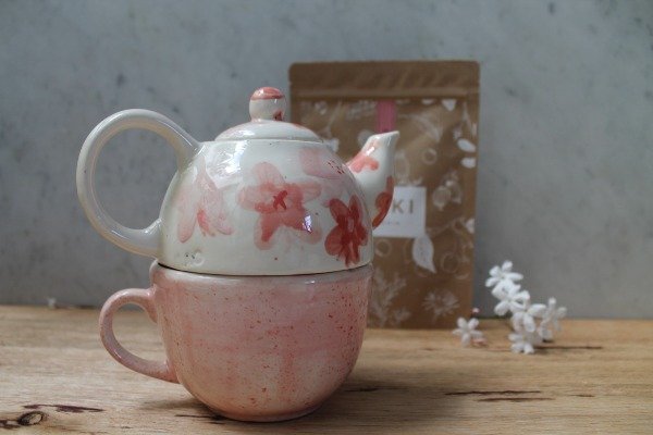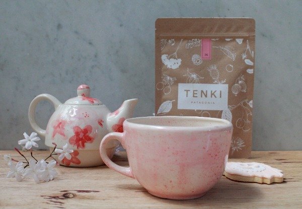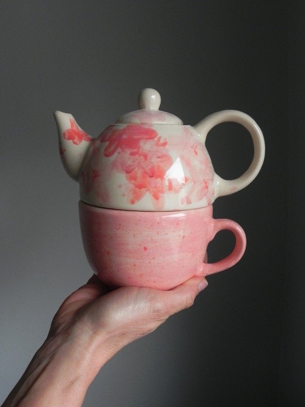 Tetera con flores rosas y taza rosa salpicada, ideales para un rico tecito