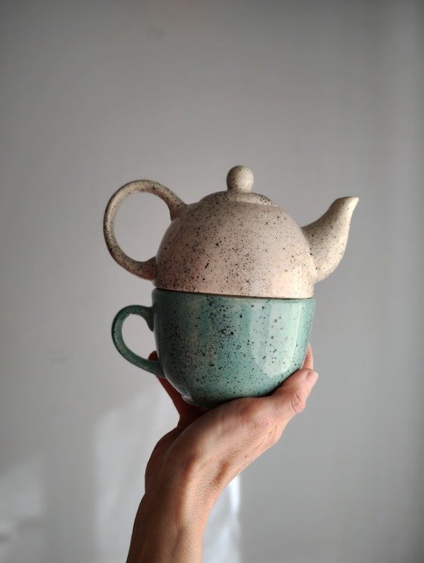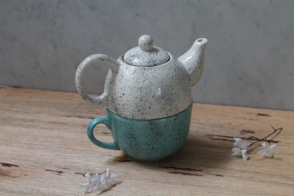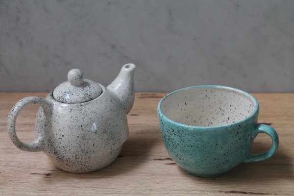 Tetera salpicada en tonos negros y taza turquesa salpicada, ideales para un rico tecito